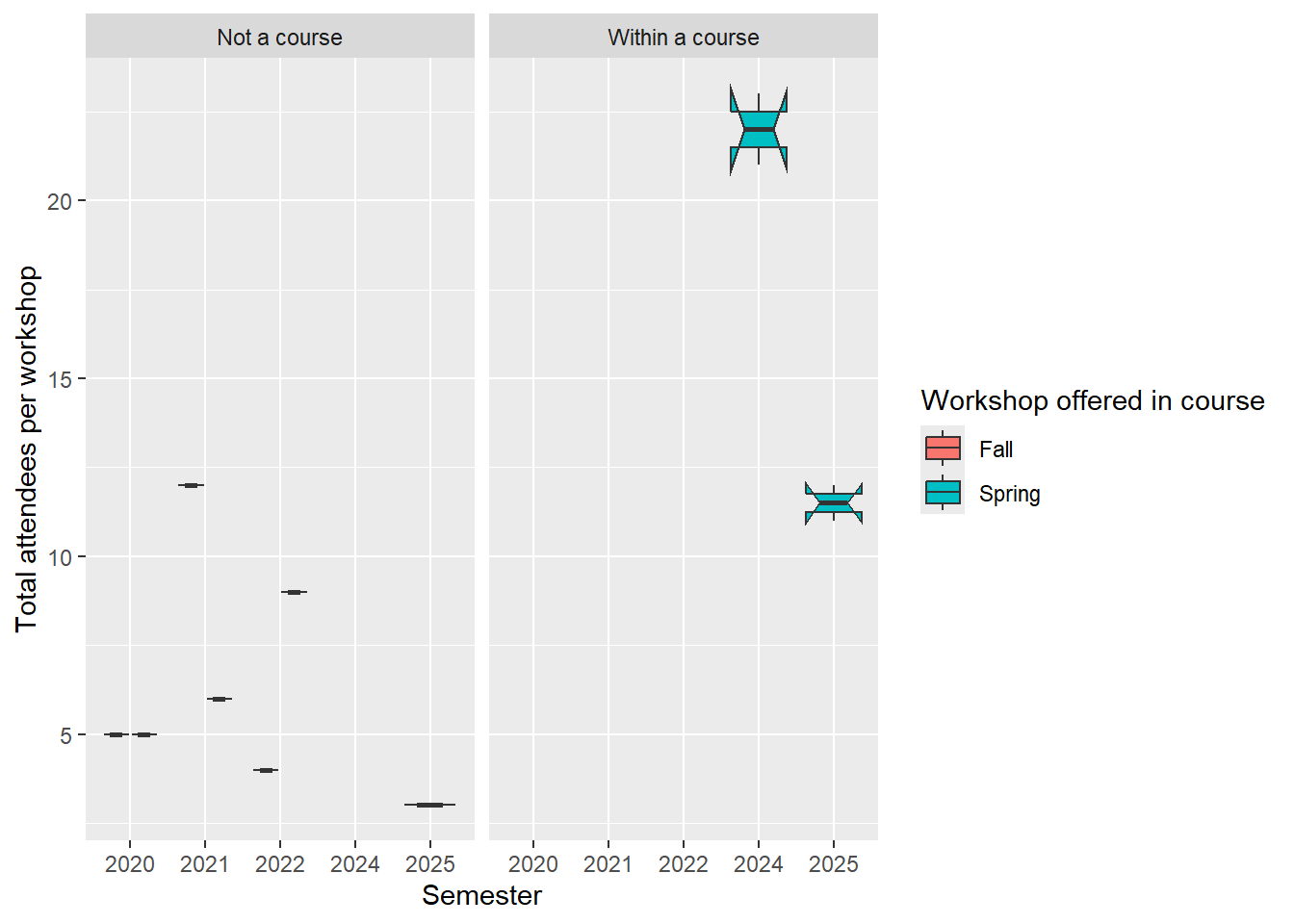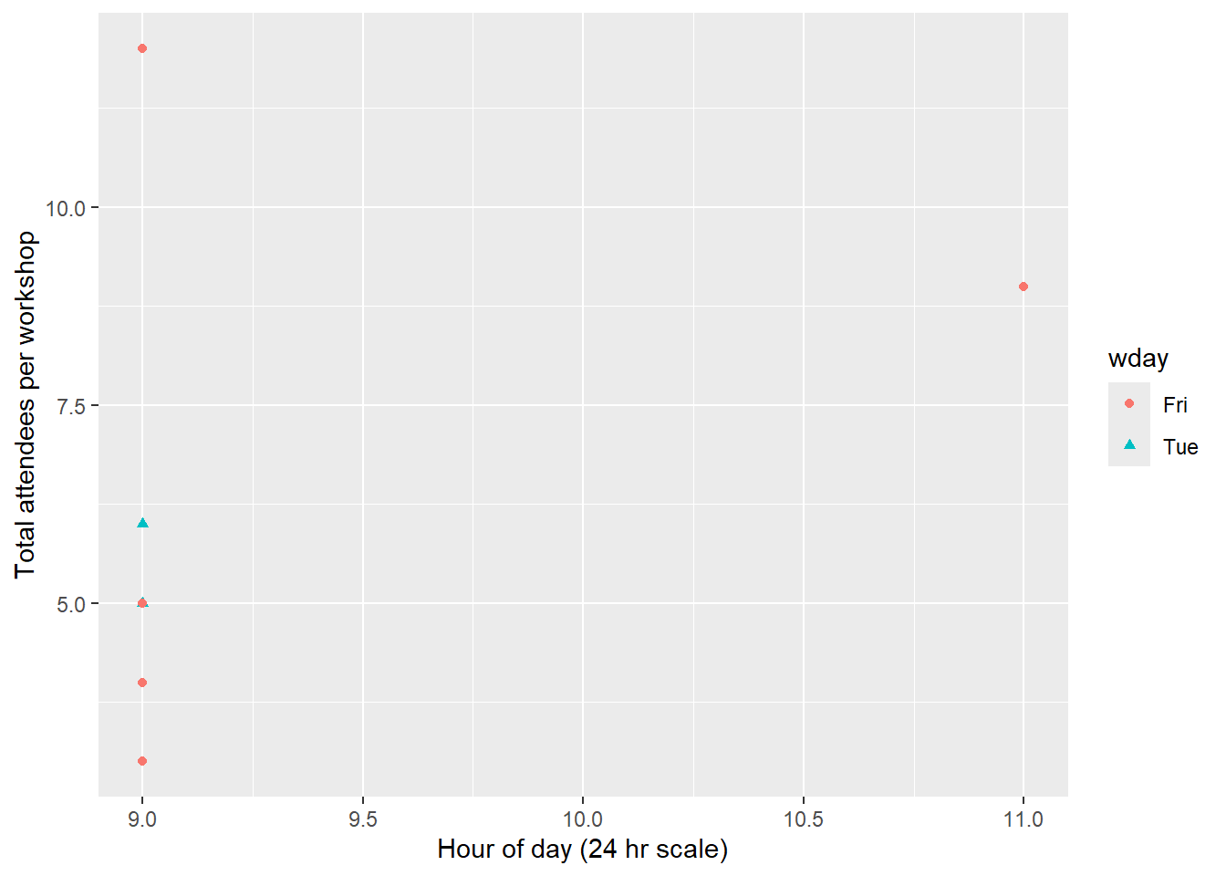 There are no obvious trends based on time of day or weekday with the current sample size. In-class workshops do not record time of day and thus are not included.