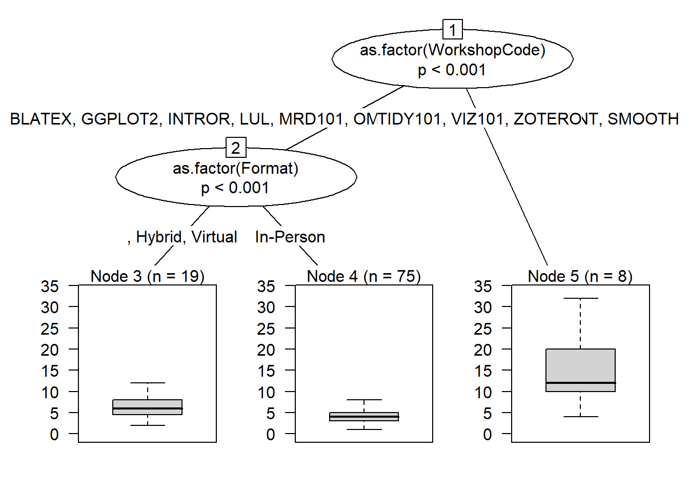 We removed workshop topic as a variable to split on, because some topics were only offered once and so that variable is a less informative split.